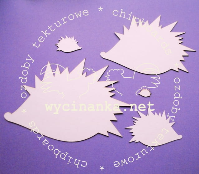 Zestaw pięciu tekturowych jeży w rozmiarach 2,4,8,14,18 cm (mierzone od noska po kolce).