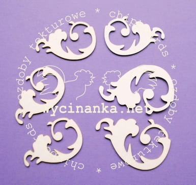 Sześć wycinanek z białej tekturki o grubości 1 mm. Wymiary wycinanek w najszerszym miejscu - ok. 5 i ok. 6 cm.