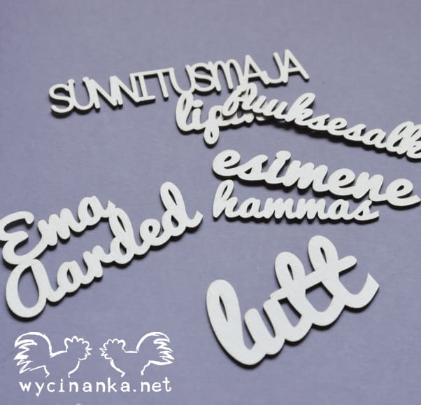 Zestaw sześciu napisów wyciętych z tektury o grubości 1 mm.