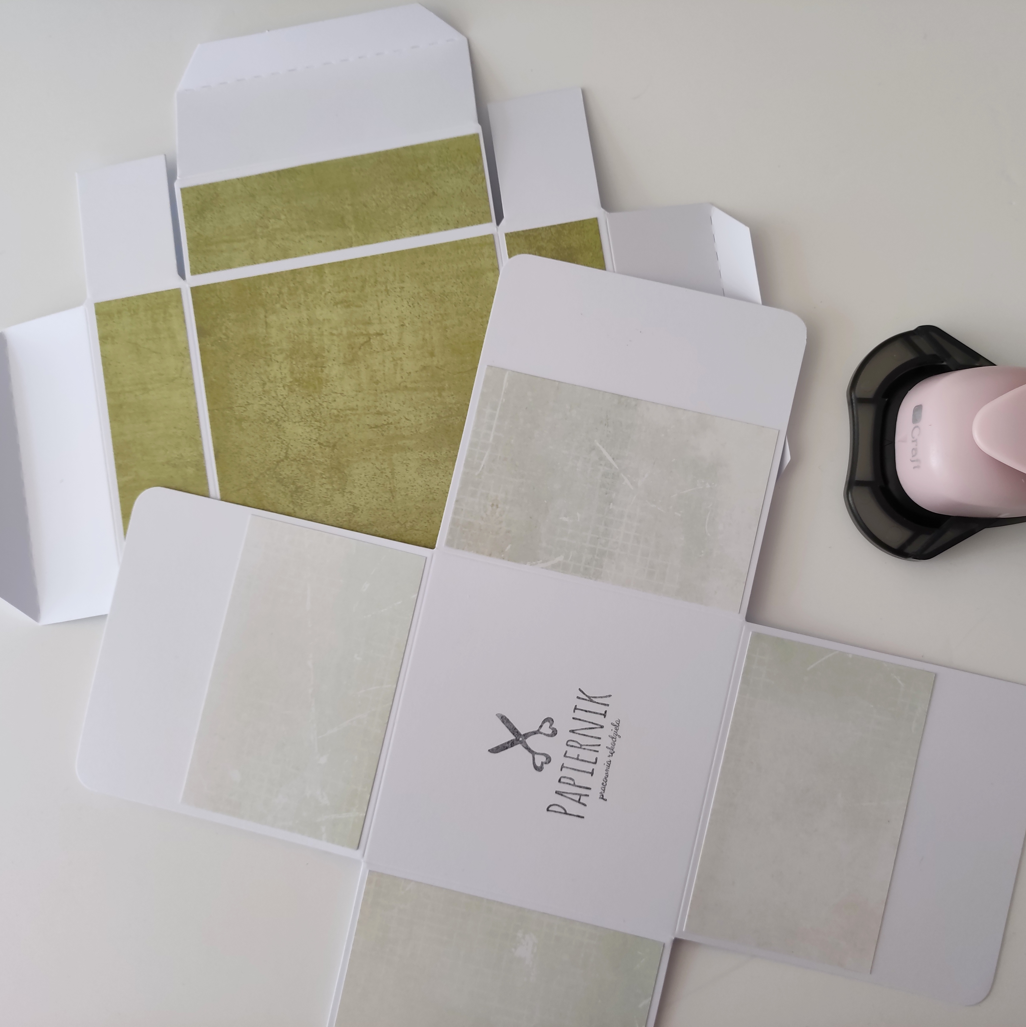 - Zaczynam od przygotowania bazy boxa – na dnie odbijam stempelek z moim logo i zaokrąglam dziurkaczem rogi. Na zewnętrznej stronie boxa klejem introligatorskim przyklejam na każdej ze ścianek papier o wymiarach 9,5x6cm. Oklejam też wieczko boxa kontrastowym kolorem papieru. Używam kawałków o wymiarach 10x10cm oraz 4 pasków 3x10cm.