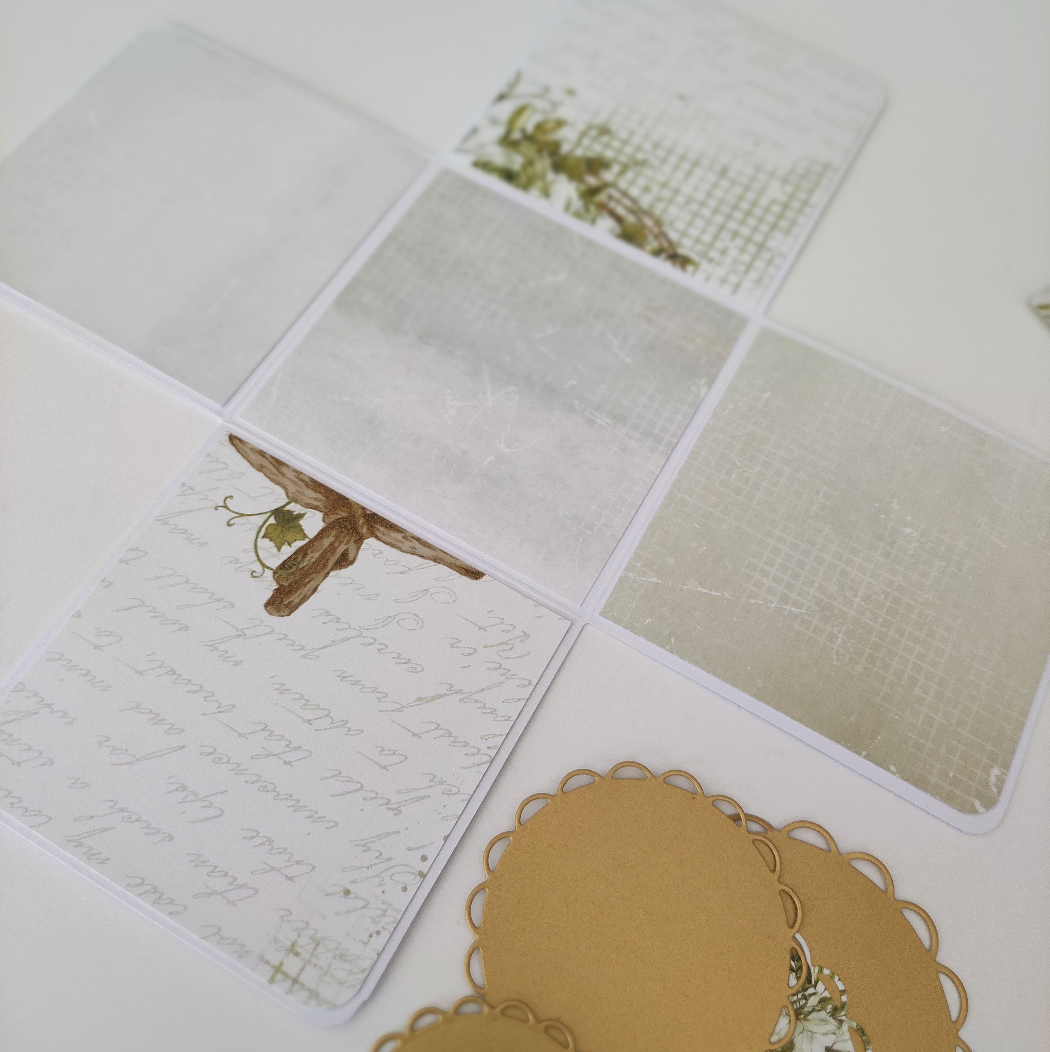 - Teraz przechodzę do oklejania wnętrza boxa. Przygotowałam 5 kwadratów papieru o wymiarach 9,5x9,5cm. Cztery z nich zaokrąglam na dwóch rogach, aby pasowały do bazy.