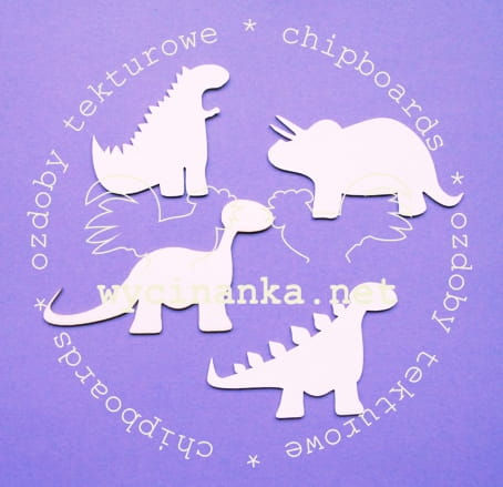 Zestaw czterech dinozaurów wykonanych z białej tekturki o grubości 1 mm.