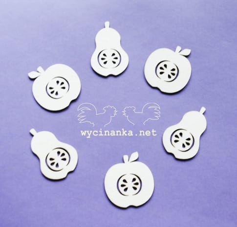 Zestaw trzech gruszek i trzech jabłek wyciętych z lekkiej, białej tekturki o grubości 1 mm.