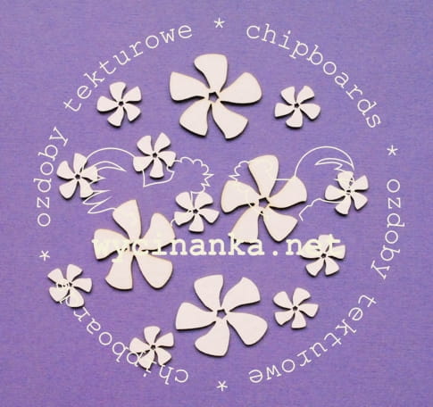 Zestaw czternastu kwiatków. Wielkość kwiatków 3,5cm oraz 1,7cm.