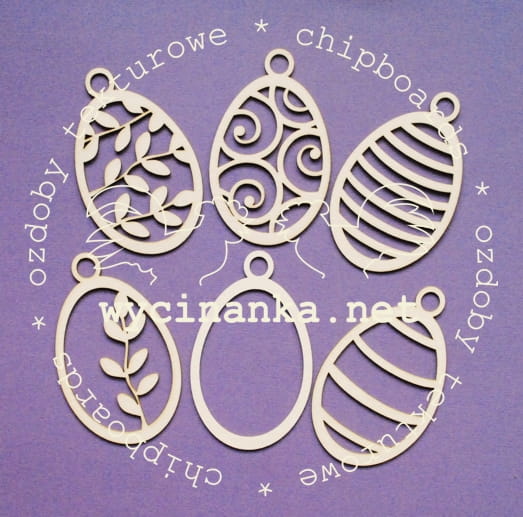 Zestaw sześciu tekturowych pisanek, nadających się dzięki zawieszkom zarówno do dekoracji domu, jak i do ozdabiania świątecznych kart z życzeniami.