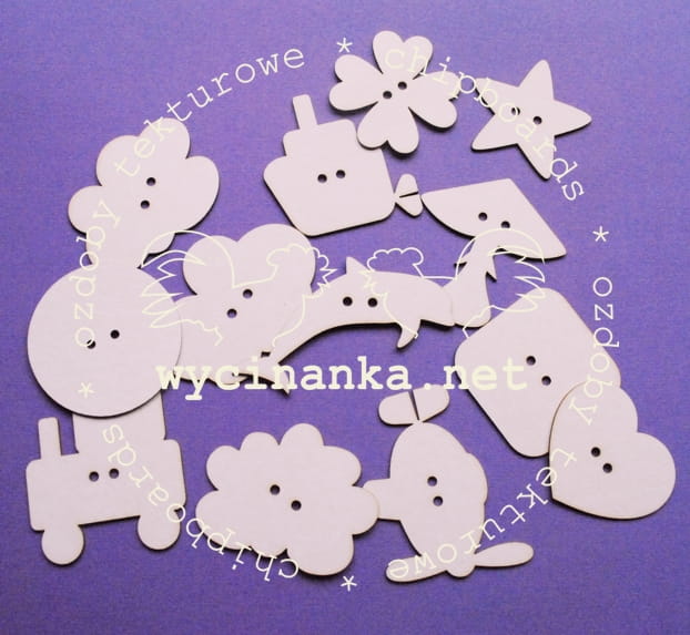 Trzynaście tekturowych elementów wyciętych z białej tekturkio grubości 1 mm.