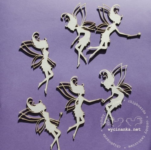 Sześć sylwetek wróżek o wysokości około 7,5 cm, wykonanych z lekkiej, białej tekturki o grubości 1 mm.