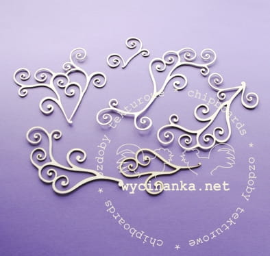 Zestaw sześciu delikatnych, uniwersalnych zawijasków wykonanych z tekturki o grubości 1 mm.